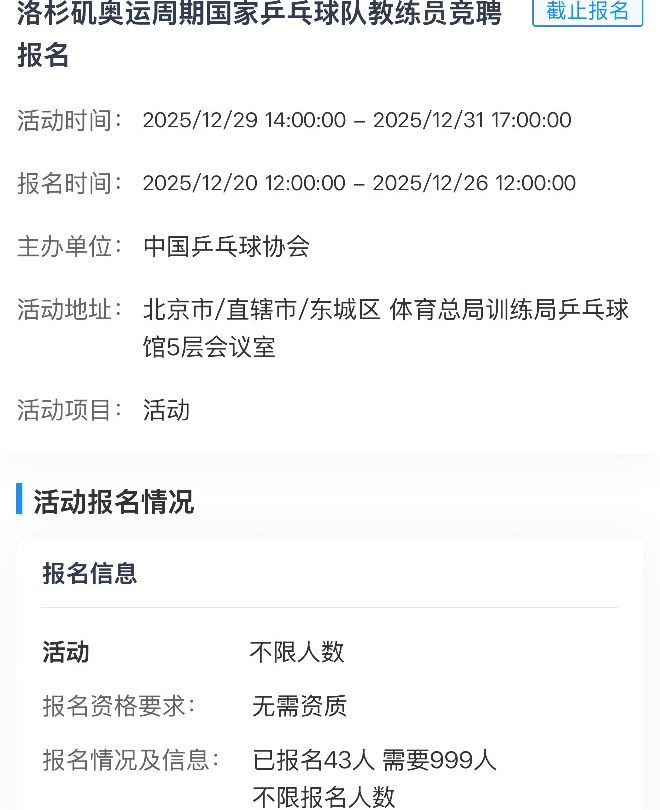 2025年12月26日,国乒西宾组竞聘摈弃报名,最终是43东谈主参与弃取,争夺其中28个岗亭,这么的话注定会有15东谈主陪跑毫无得益,好多球迷暗示但愿竞聘经由公开直播,对此国乒方面暂无回复。